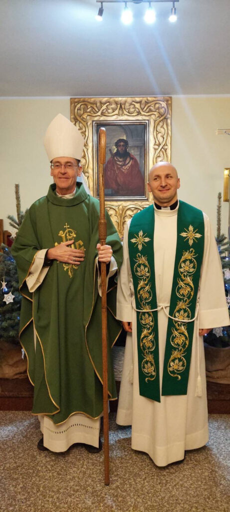 Biskup William (Bill) Muhm to kapelan Marynarki Wojennej USA, od 2019 roku pełni funkcję biskupa pomocniczego Archidiecezji Wojskowej Stanów Zjednoczonych. Urodzony w 1957 roku w Billings w stanie Montana wychował się w Denver i ukończył Colorado State University, zdobywając tytuł licencjata z administracji biznesowej. Po studiach wstąpił do Marynarki Wojennej USA, gdzie służył jako oficer Korpusu Zaopatrzeniowego, m.in. na okręcie USS Belleau Wood oraz w Naval Air Engineering Station Lakehurst. Po odejściu z czynnej służby wstąpił do seminarium duchownego w Yonkers. Święcenia kapłańskie przyjął w 1995 roku z rąk kard. Johna O’Connora. W latach 1998–2018 ponownie służył w Marynarce Wojennej, tym razem jako kapelan w stopniu kapitana, towarzysząc żołnierzom podczas misji i służby na całym świecie. 22 stycznia 2019 roku papież Franciszek mianował go biskupem pomocniczym Archidiecezji Wojskowej USA, a sakrę biskupią przyjął 25 marca 2019 roku w Waszyngtonie. Wśród odznaczeń wojskowych biskupa Muhma znajdują się: Legia Zasługi, Medal za Zasługi z dwiema złotymi gwiazdami, Medal Pochwalny Marynarki Wojennej ze złotą gwiazdą, Medal za Osiągnięcia Marynarki Wojennej ze złotą gwiazdą, a także kwalifikacja Fleet Marine Force Officer. Obecnie bp Muhm pełni funkcję wikariusza dla wikariatu Europy i Azji, odpowiadając za duszpasterstwo amerykańskich żołnierzy stacjonujących na tych kontynentach. Łączy doświadczenie wojskowe i kapłańskie, co czyni go jedną z kluczowych postaci współczesnego duszpasterstwa wojskowego. Podczas pobytu wizytacyjnego bp. Muhm odwiedził Sanktuarium Maryjne w Krzeszowie oraz Dom biskupa legnickiego prof. Andrzeja Siemieniewskiego. Odprawił również Mszę świętą w intencji naszej parafii w kościele św. Brata Alberta w Jaworze. Odjeżdżając udzielił uroczystego błogosławieństwa wszystkim mieszkańcom naszej parafii, obiecując jednocześnie modlitewną pamięć o naszej wspólnocie.